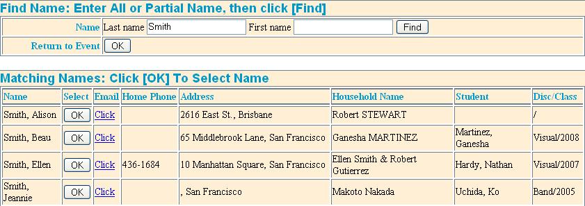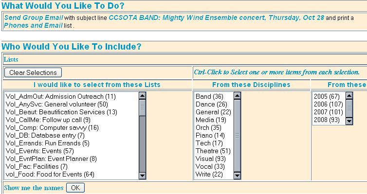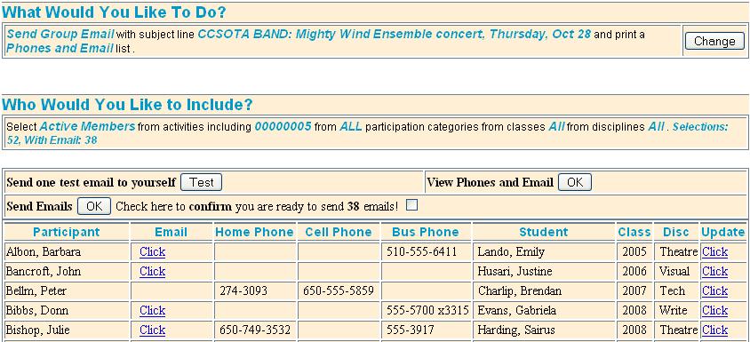 Once you select your criteria, you will see a list of all names, including phones, email, and, if applicable, student info.